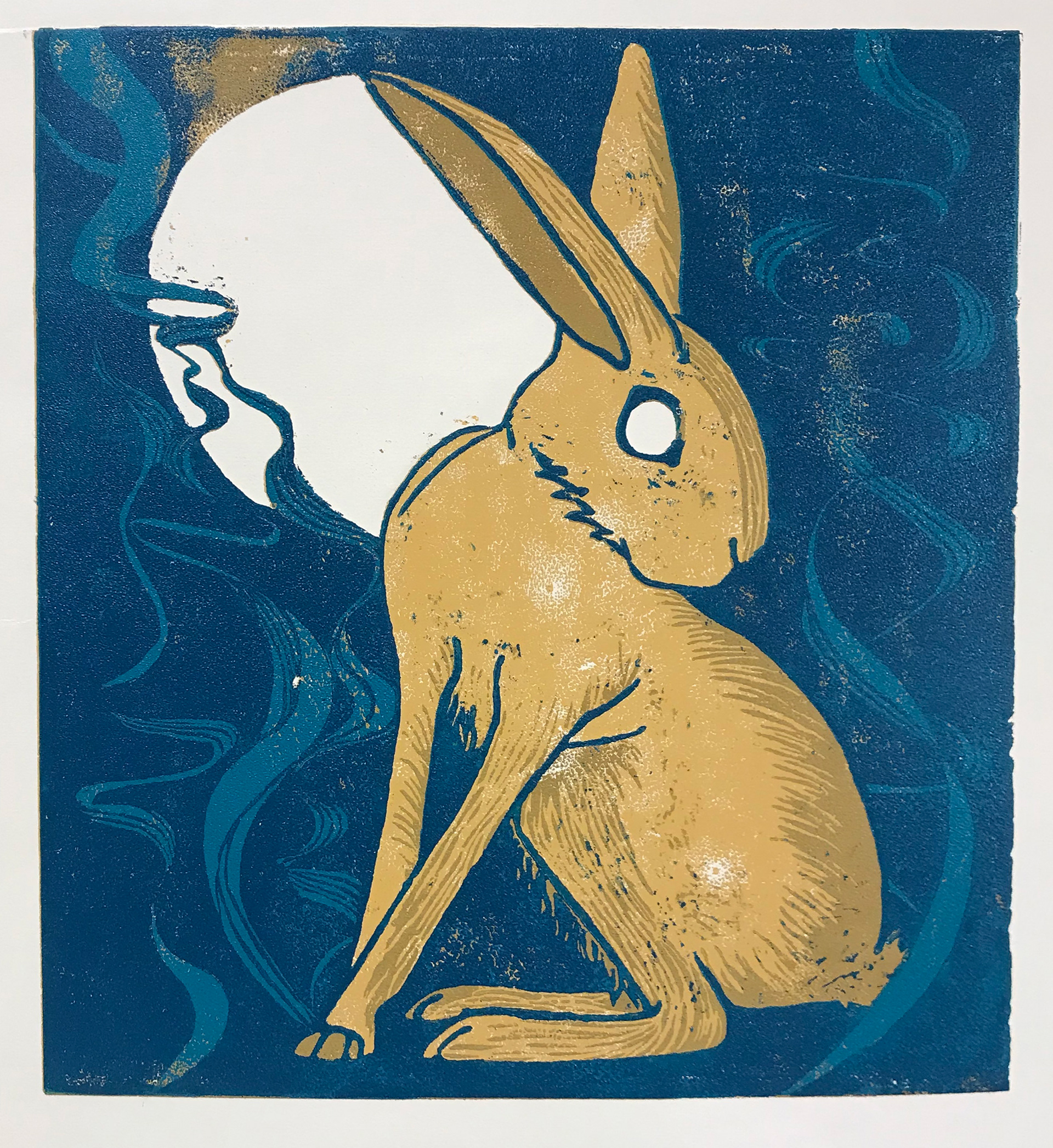 This piece is called “phased”. It is meant to have a mysterious undertone. The hare is staring right at the viewer.